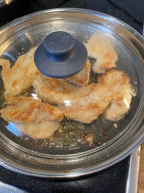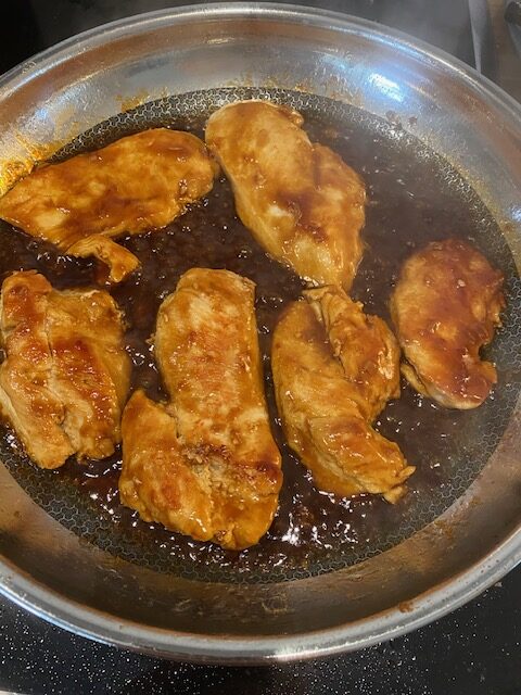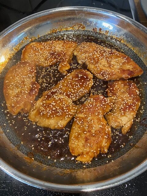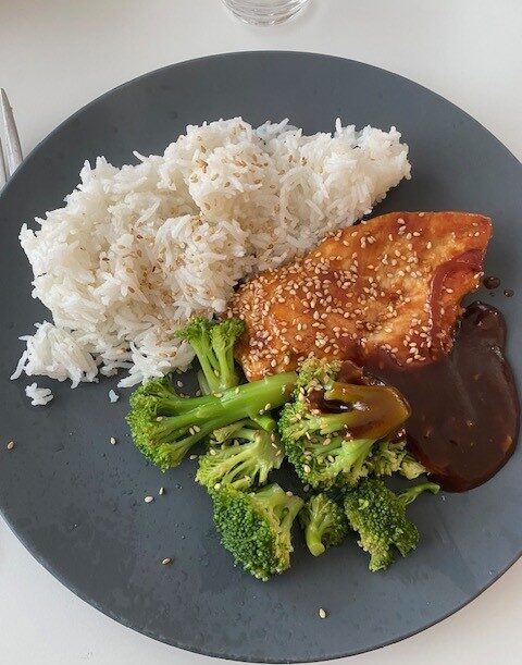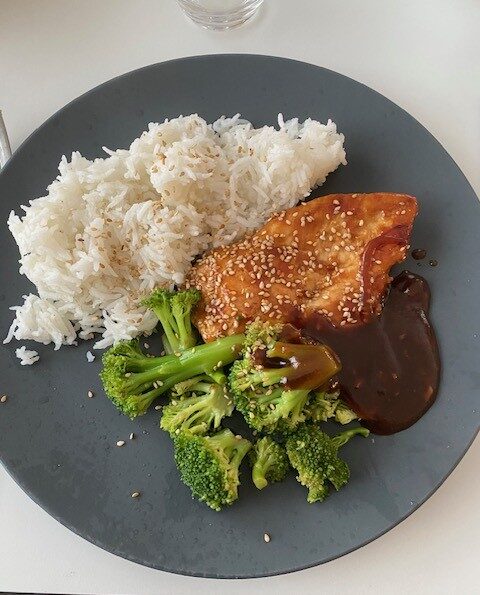 Vi kokar riset i en riskokare så det startar vi först och sen är det klart i lagom tid. Broccolin kör vi sist i micron. Dela filéerna längsmed så det blir två tunna filéer. Stek i smör eller olja, vilket ni själva föredrar, på medelhög värme. Inga kryddor! När filéerna är klar så sänker ni värmen och häller på teriyaki efter smak och vänder runt filéerna tills dom är helt täckta och det finns lite sås extra.